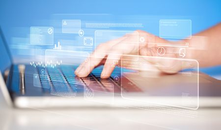Hand touching keyboard with high tech button screen