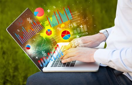 Hand typing on modern laptop notebook computer with future graph icons and symbols