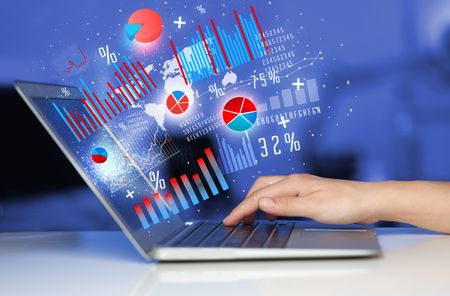 Hand typing on modern laptop notebook computer with future graph icons and symbols