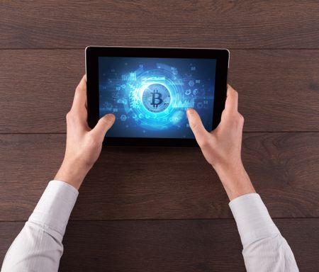 Hand working on tablet with cryptocurrency and network concept