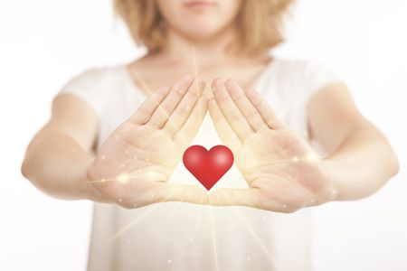 Hands creating a form with shining red heart in the center