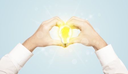 Hands creating a form with yellow light bulb in the center