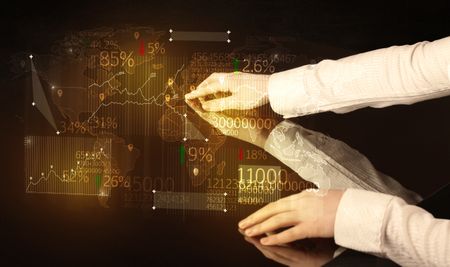 Hands navigate on high tech smart table with business icons and symbols