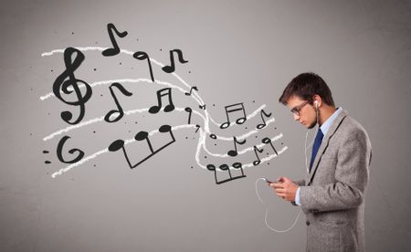 handsome boy singing and listening to music with musical notes getting out og his mouth