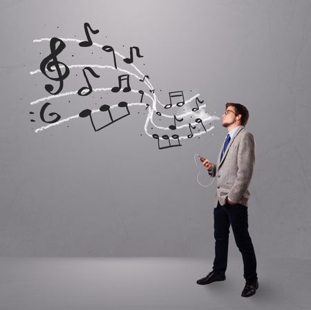 handsome boy singing and listening to music with musical notes getting out og his mouth