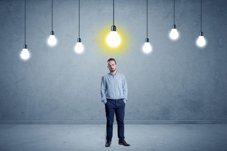 Handsome businessman in an empty space with bulbs above and uninspired face