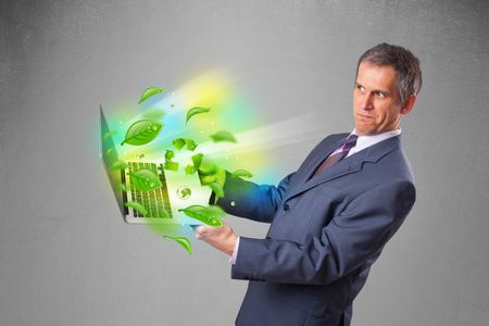 Handsome businessman holding laptop with recycle and environmental symbols