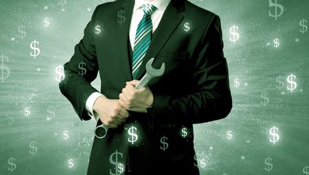 Handsome businessman holding tool with dollar symbols around and with green background