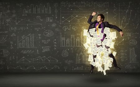 Handsome businessman jumping with paper document cloud around him