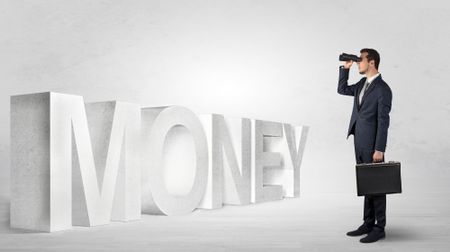 Handsome businessman looking forward with binoculars at a job, income and money concept