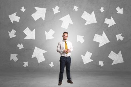 Handsome businessman standing in front of a wall with chalk drawn arrows