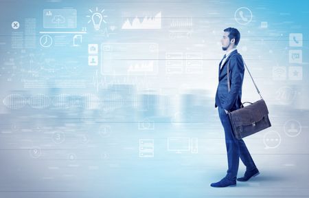 Handsome businessman walking in suit with briefcase on his hand and database concept around