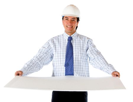 Handsome engineer holding a model isolated on white