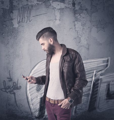 A handsome hipster guy with beard and sunglasses standing in front of an urban wall with graffiti concept