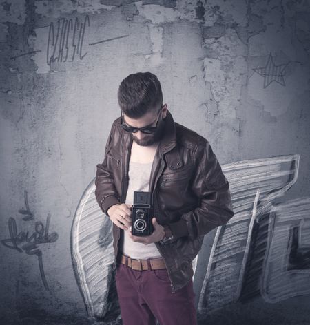 A handsome hipster guy with beard and sunglasses standing in front of an urban wall with graffiti concept