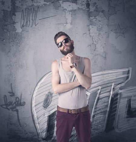 A handsome hipster guy with beard and sunglasses standing in front of an urban wall with graffiti concept