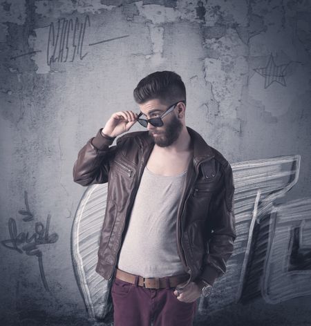 A handsome hipster guy with beard and sunglasses standing in front of an urban wall with graffiti concept