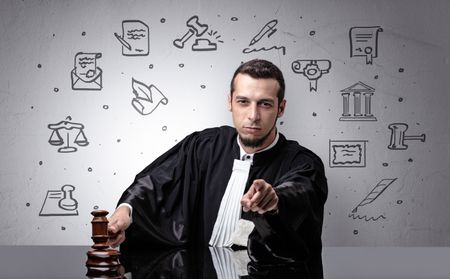 Handsome judge with court symbols around