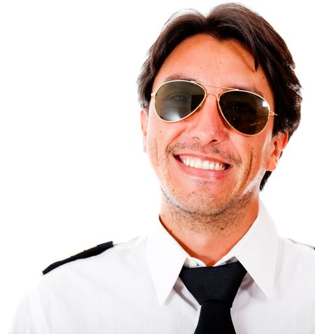 Handsome male pilot smiling - isolated over a white background