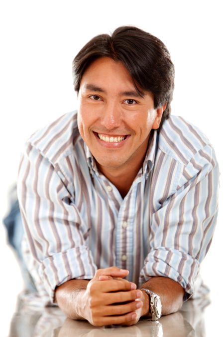 Handsome man lying on the floor and smiling - isolated