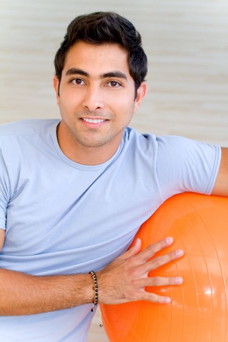handsome man portrait at the gym smiling leaning on a pilates ball