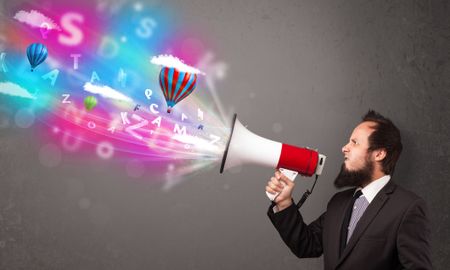 Handsome man shouting into megaphone and abstract text and balloons come out