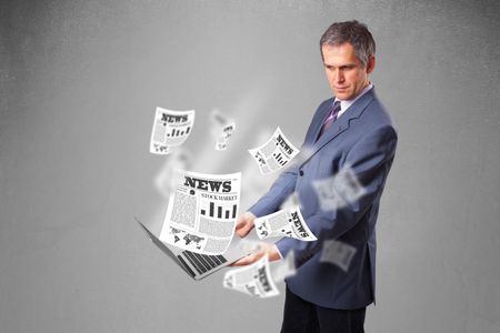 Handsome middle aged businessman holding notebook and reading the explosive newspaper