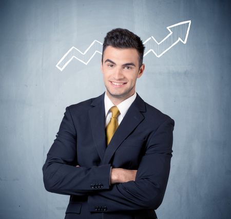 A handsome sales guy standing in front of a blue urban concrete wall with illustration of white graph chart arrows cocncept