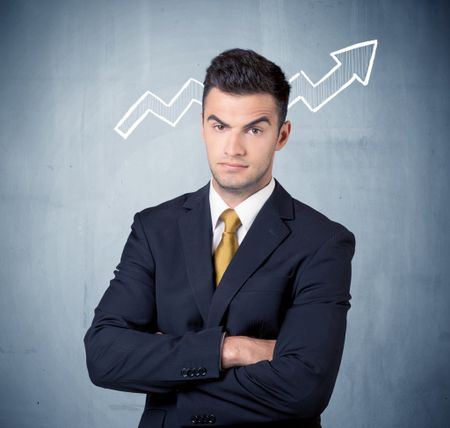 A handsome sales guy standing in front of a blue urban concrete wall with illustration of white graph chart arrows cocncept
