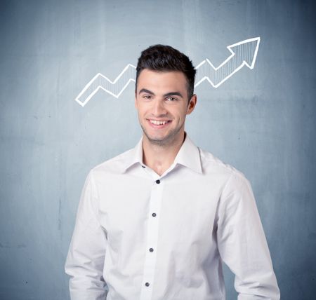 A handsome sales guy standing in front of a blue urban concrete wall with illustration of white graph chart arrows cocncept