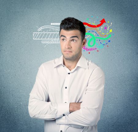 A handsome sales person standing in front of a blue urban concrete wall with illustration expressing creativity by transforming white lines to colorful arrows cocncept