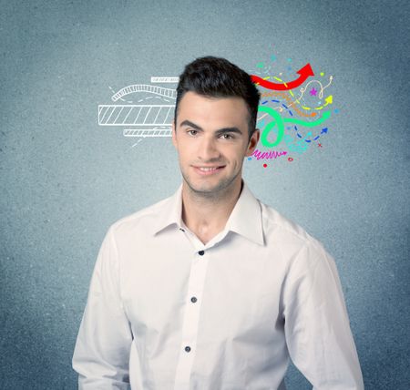 A handsome sales person standing in front of a blue urban concrete wall with illustration expressing creativity by transforming white lines to colorful arrows cocncept