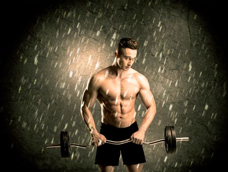 A handsome young body builder weightlifting while showing his muscular upper body in the rain concept
