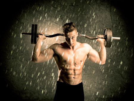 A handsome young body builder weightlifting while showing his muscular upper body in the rain concept
