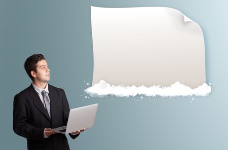 handsome young man holding a laptop and presenting modern copy space on clouds