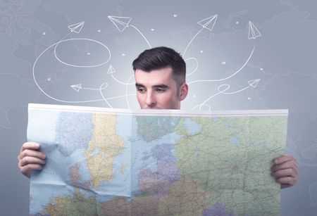 Handsome young man holding a map with drawn paper planes flying behind him