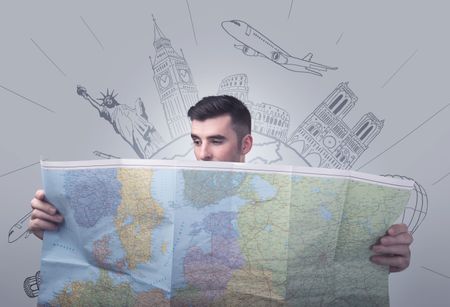 Handsome young man holding a map with famous sightseeing destinations above his head