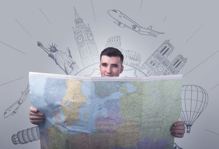 Handsome young man holding a map with famous sightseeing destinations above his head