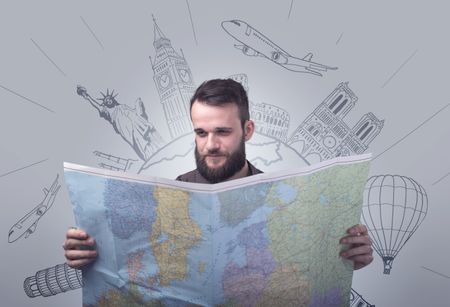 Handsome young man holding a map with famous sightseeing destinations above his head