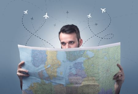 Handsome young man holding a map with little planes and their paths above him