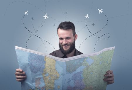 Handsome young man holding a map with little planes and their paths above him