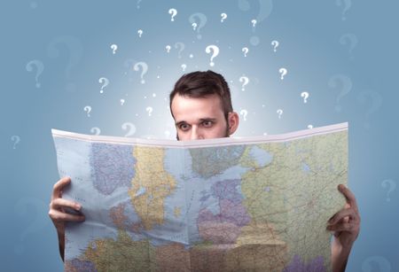 Handsome young man holding a map with white question marks above his head
