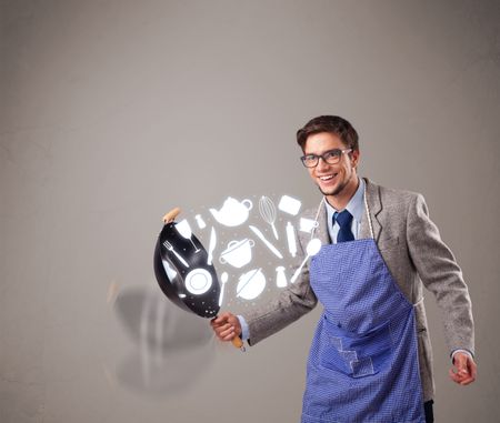 Handsome young man with kitchen accessories icons