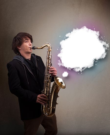 Handsome young man playing on saxophone with copy space in white cloud