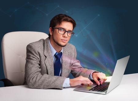Handsome young man sitting at desk and typing on laptop with abstract lights