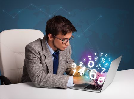 Handsome young man sitting at desk and typing on laptop with 3d numbers comming out