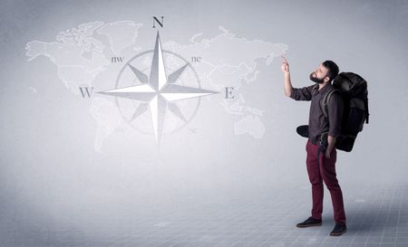 Handsome young man standing with a backpack on his back and a compass and a world map in the background