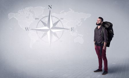 Handsome young man standing with a backpack on his back and a compass and a world map in the background