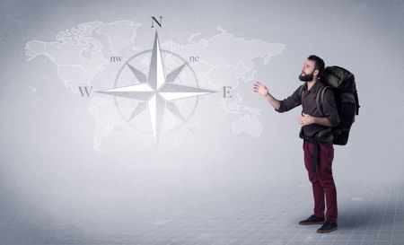 Handsome young man standing with a backpack on his back and a compass and a world map in the background