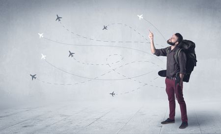 Handsome young man standing with a backpack on his back and little planes in the background